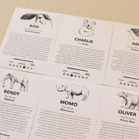 Each animal has an educational label with an illustration of the animal, a short text about it and its conservation status in the wild.
